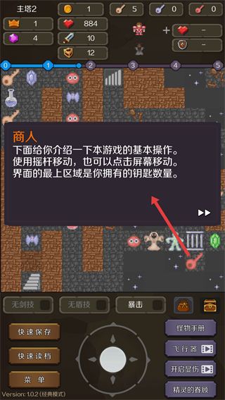 4、根據商人提示掌握游戲基本操作,可通過搖桿或點擊屏幕移動角色,同時關注界面上方的鑰匙數量,以便順利開門。