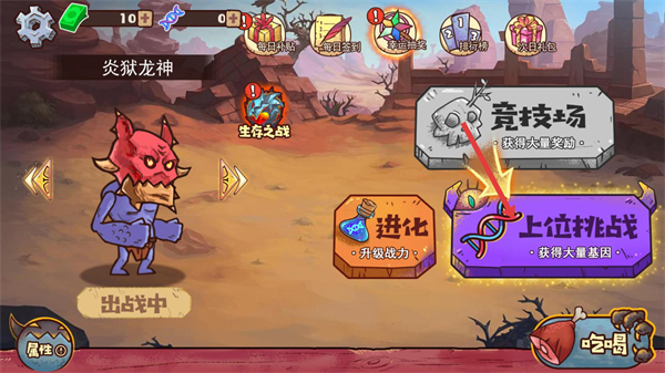 1、點擊上位挑戰可進入高難度戰斗,挑戰成功能獲得大量基因,這些基因是魔物進化的關鍵資源,需優先參與。