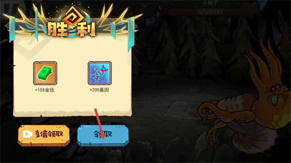 4、戰斗勝利后點擊領取可獲得金錢、基因等獎勵,這些資源可用于魔物進化與技能升級,推進游戲進度。
