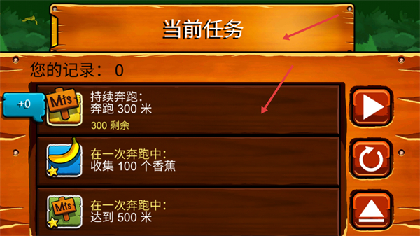 2、在當前任務界面,需關注持續奔跑300米、一次奔跑收集100個香蕉、一次奔跑達到500米這幾個任務,完成它們可推進游戲進程。