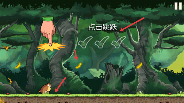 3、游戲中看到點擊跳躍提示時,點擊屏幕可讓角色跳躍,以此躲避障礙、收集香蕉,助力奔跑。