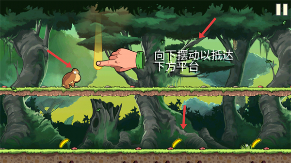 4、當出現向下擺動以抵達下方平臺提示時,按照指引操作,可讓角色抵達下方平臺,繼續收集香蕉并前進。