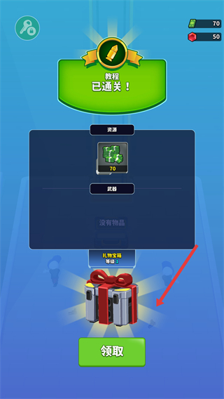 4、通關教程后,點擊領取按鈕,可獲得70貨幣和等級1的禮物寶箱,這些資源可用于后續的武器升級和角色強化。
