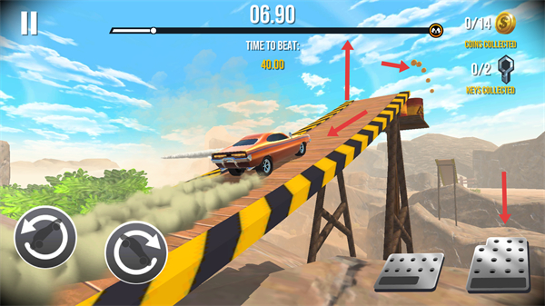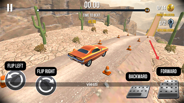 1、在沙漠賽道駕駛時,利用FORWARD加速鍵提升車速,同時注意躲避路障,收集金幣和鑰匙,爭取在40秒內完成關卡。