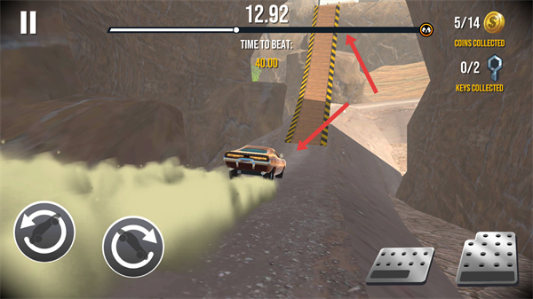 2、行駛到坡道時,加速沖坡,在空中可收集金幣,落地時需控制車輛平衡,避免翻車,確保順利通過坡道。