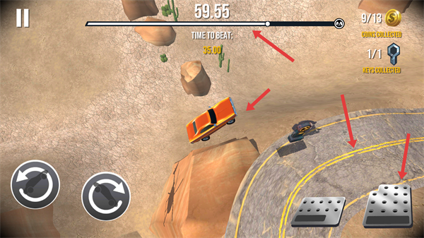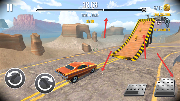 1、在沙漠賽道駕駛時,利用加速鍵提升車速,同時注意收集金幣和鑰匙,關注時間進度,爭取在35秒內完成關卡。
