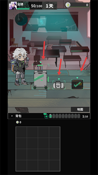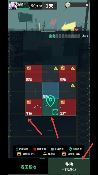2、在地圖界面點擊移動按鈕前往不同區域,優先選擇有高級資源或保險箱的地點,合理利用行動點,高效收集資源。