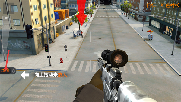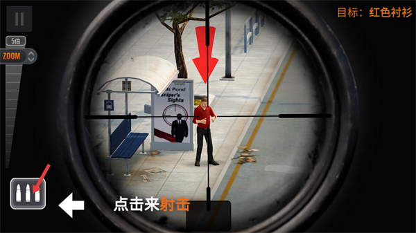 2、放大視野后,瞄準目標紅色襯衫并點擊屏幕完成射擊,需確保準星對準目標關鍵部位以提升命中率。