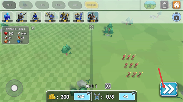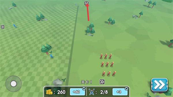 2、關卡中需部署己方單位如藍色士兵,點擊右下角箭頭按鈕可啟動戰斗,需根據敵方單位數量合理配置己方兵力。
