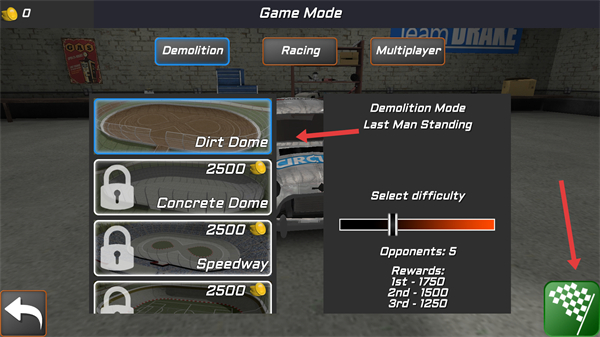 1、選擇Demolition模式和DirtDome賽道,調整難度后點擊綠色旗幟按鈕開始游戲,開啟車輛demolition對戰。