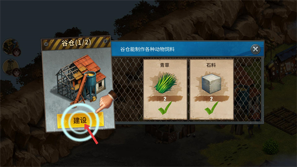 3、在建筑界面點擊建設,消耗對應資源如青草、石料可完成谷倉建造,谷倉用于制作動物飼料,是資源生產的核心建筑之一。