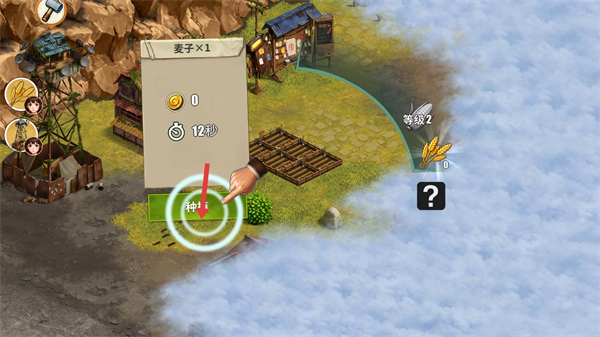 4、在農田區域點擊種植,消耗種子如麥子可啟動作物種植,等待對應時長如12秒后可收獲資源,用于后續生產或建設。