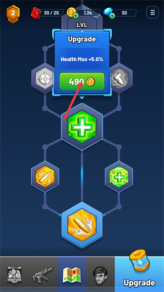 3、選擇生命值上限等節點,消耗金幣490升級,可直接提升角色的生存上限,增強關卡中的抗傷能力。
