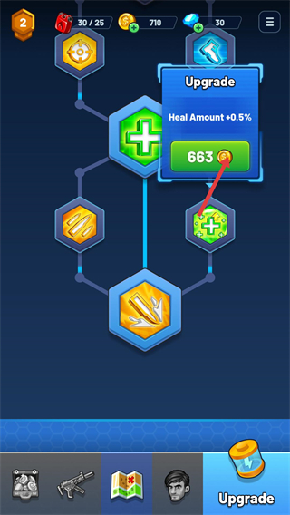 4、在升級界面點擊技能節點如治療量,消耗對應金幣663,可解鎖該增益效果,提升角色的生存能力。