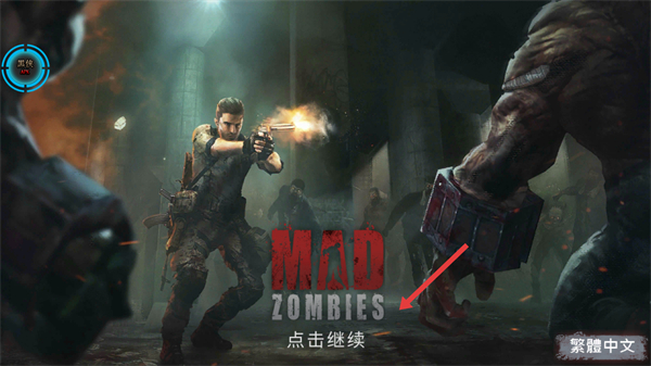 1、進入游戲時看到MADZOMBIES界面,點擊繼續即可開始游戲,開啟你的僵尸射擊之旅。