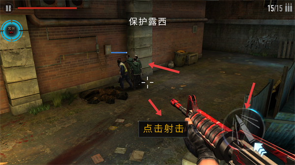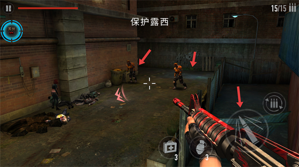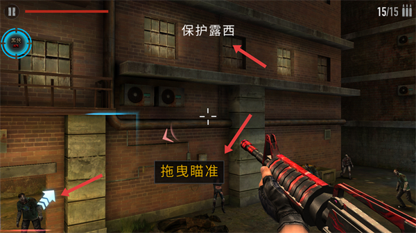 2、游戲中出現保護露西的任務時,需拖曳屏幕瞄準僵尸,同時注意左側出現的僵尸,及時調整瞄準方向。