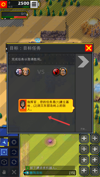 1、游戲開始時需明確任務目標是建立基地并消滅東部島嶼上的敵人,完成任務可取得勝利,需據此規劃后續行動。