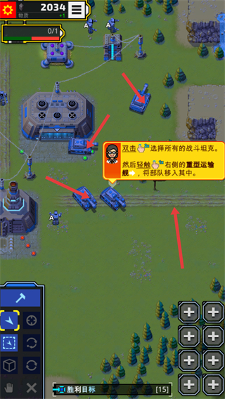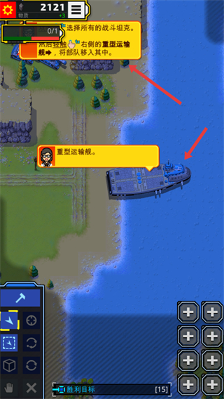 2、雙擊選擇所有的戰斗坦克,然后輕觸右側的重型運輸艦,將部隊移入其中,以便進行后續的跨海作戰部署。