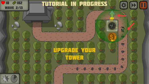 2、當塔樓可升級時及時點擊升級按鈕提升塔樓屬性,增強其攻擊力和防御能力,同時收集敵人掉落的金幣用于后續升級或建造。