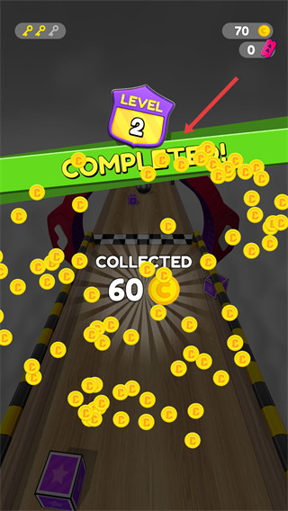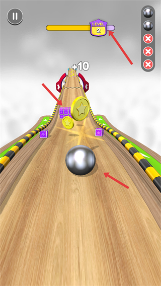 1、在Level2中控制金屬球收集軌道上的金幣和星星道具,撞擊紫色方塊,同時注意軌道兩側的障礙,持續推進以提升等級。