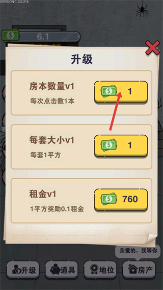 3、點擊升級按鈕進入屬性升級界面,消耗資金提升房本數量、每套大小等屬性,可增強每次收租的收益效率,加速資源積累。