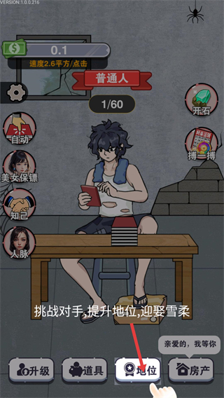 1、點擊地位按鈕進入挑戰界面,通過挑戰對手可提升地位、推進劇情如迎接雪柔,是游戲核心的逆襲成長路徑。