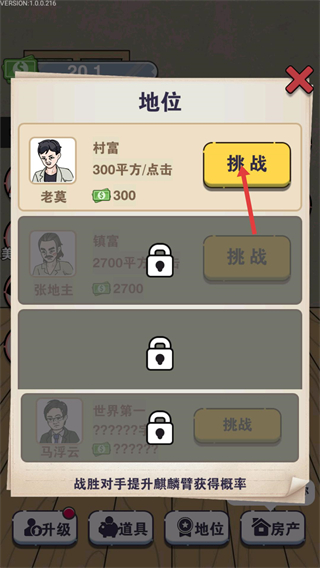 2、在地位界面選擇可挑戰的對手如村富老莫,點擊挑戰消耗對應資源發起挑戰,獲勝后解鎖更高階對手如鎮富張地主,逐步提升地位層級。