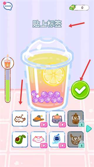4、奶茶制作完成后貼上標簽,然后點擊綠色對勾按鈕確認,完成整個制作流程,交付給顧客。