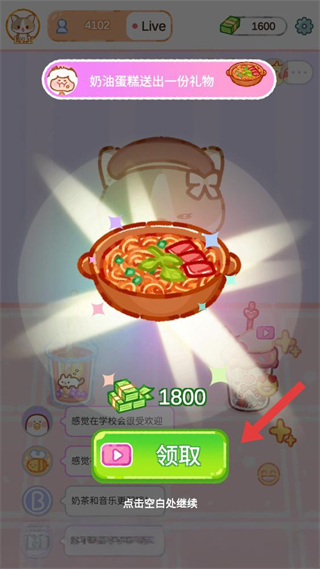 4、觀眾送出禮物后點擊領取按鈕可獲得金錢獎勵,利用這些獎勵升級食材或解鎖新的制作配方。