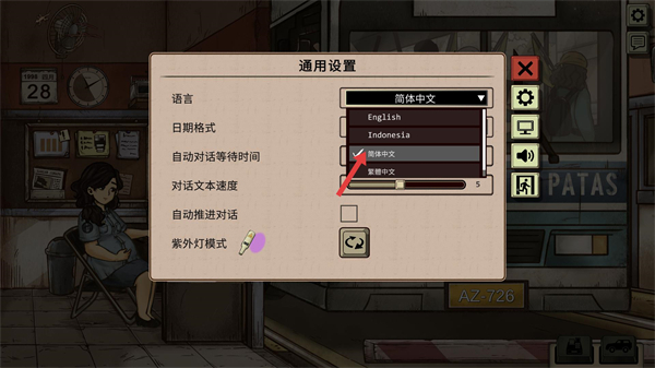 4、在語言下拉菜單中選擇簡體中文,可將游戲界面切換為中文顯示,降低理解成本,更順暢地推進劇情。