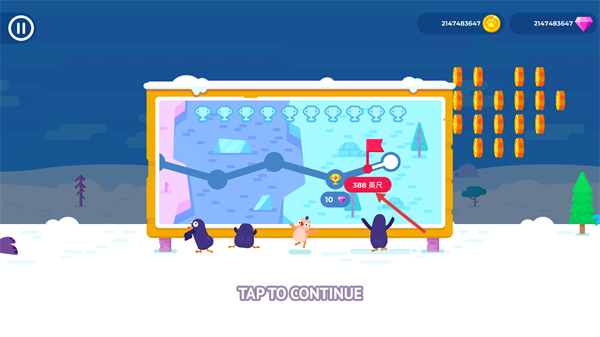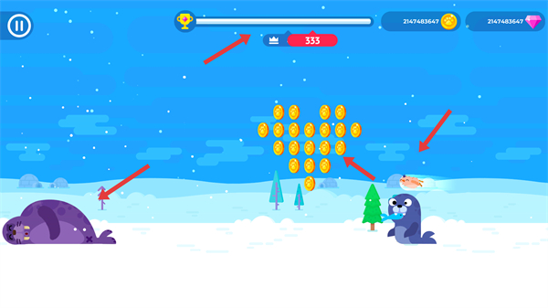 3、游戲中要收集金幣金幣可用于解鎖內容或升級,同時注意觀察場景中的元素,比如樹木、海象等,還能提升獎杯進度。