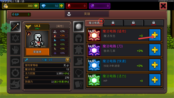 2、在英雄界面的魔法電路板塊,可升級對應技能如魔法攻擊,消耗資源提升屬性加成,增強角色輸出能力。