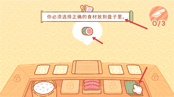 1、游戲中需根據提示選擇正確食材放到盤子里,比如制作壽司時,要留意提示的食材樣式,從提供的食材中準確選取確保食材搭配正確。