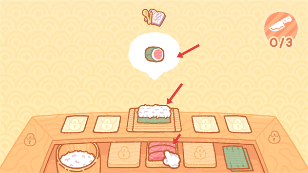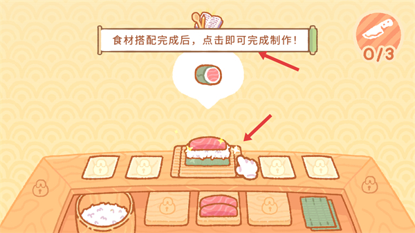 2、制作壽司時先鋪上海苔再放上米飯,然后添加對應的肉類食材,每一步都要按照提示操作,保證食材擺放順序正確。