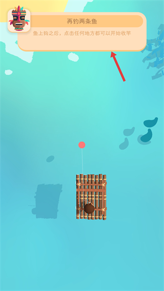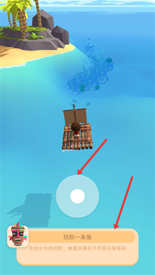 2、在海上移動時觸摸屏幕下半部分控制木筏移動,尋找水中陰影找魚,完成找到一條魚的任務,注意觀察水下動靜。