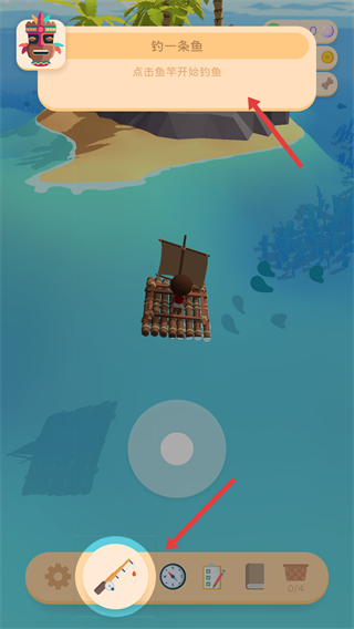 3、釣魚時點擊魚竿開始釣魚界面下方有魚竿、指南針等功能圖標,合理使用魚竿功能,完成釣一條魚的任務。