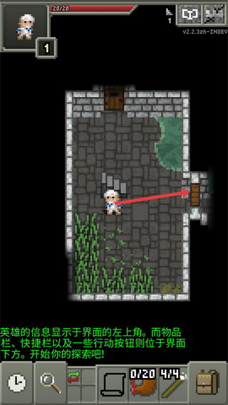 4、熟悉界面布局,左上角顯示英雄信息,下方是物品欄與操作按鈕,移動角色前往房門,推進地牢探索進度。