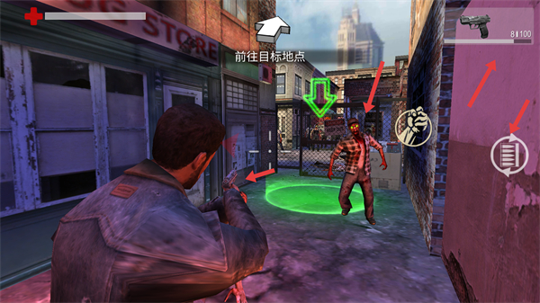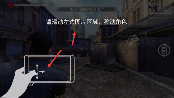 1、游戲中滑動左邊區域移動角色需熟悉移動操作,以便在僵尸場景中靈活走位,解決前方僵尸,完成任務推進游戲。