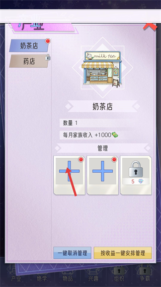 2、在產業界面選擇奶茶店,該產業每月可為家族帶來1000的收入,點擊管理按鈕可安排成員運營,提升產業收益。