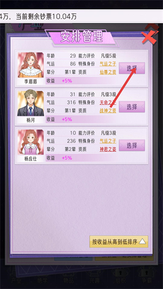 3、進入安排管理界面,選擇收益加成高的成員如李眉眉管理產業,能最大化提升產業的月收入。