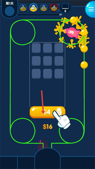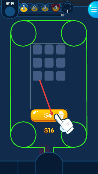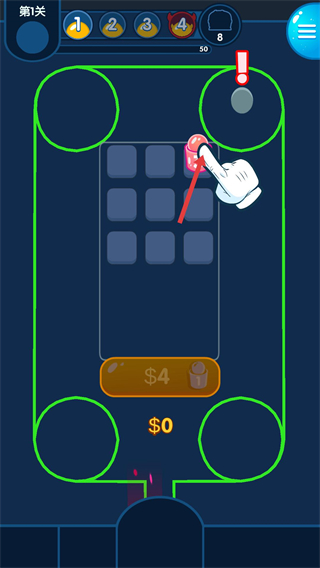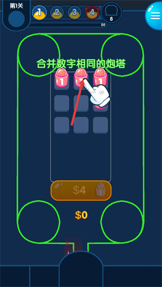 1、在第1關界面,點擊下方4按鈕消耗金幣,在網格中生成數字1的炮塔,這是構建防御的基礎步驟。