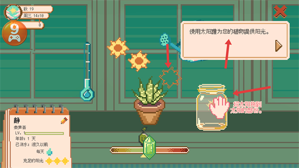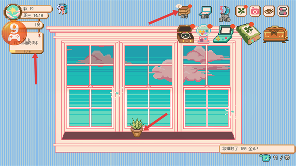 1、關注左上角的時間、季節和任務進度,及時完成照顧植物等任務獲取獎勵。