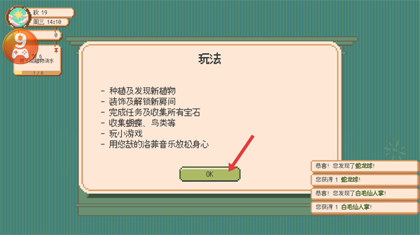 3、熟悉游戲玩法包括種植新植物、裝飾解鎖新房間、收集寶石、蝴蝶、鳥類,玩小游戲以及用治愈音樂放松。
