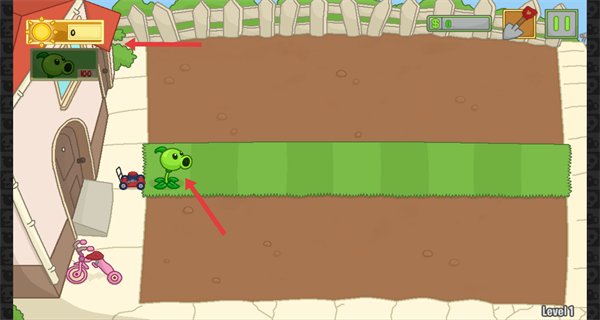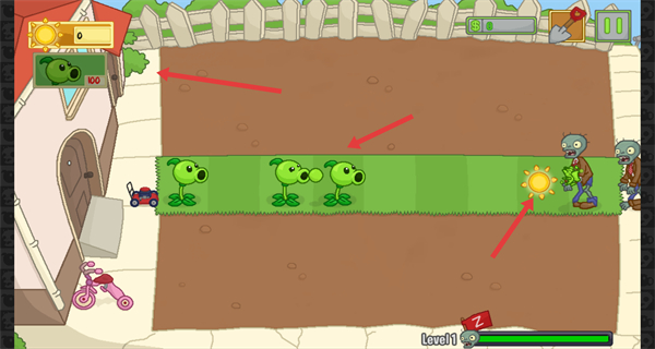 2、收集陽光,利用陽光種植豌豆射手等植物,構建起抵御僵尸進攻的第一道防線。
