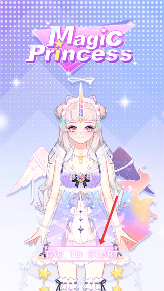1、點擊TAPTOSTART開始游戲進入魔法公主的裝扮世界,打造屬于自己的魔法公主形象。