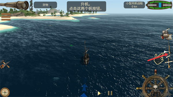 2、進入關卡后,按提示點擊帆按鈕完成升帆操作,為船只提供動力,這是操控船只移動的基礎步驟。