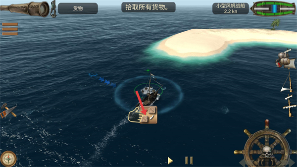 3、轉動界面中的舵盤調整船只方向,駛向目標貨物區域,需精準控制方向以接近目標,推進任務進度。