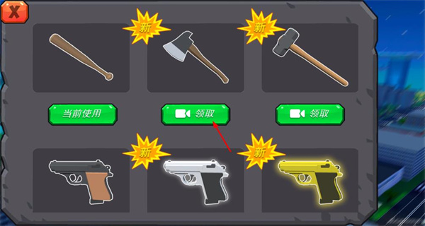 4、在武器商城界面,有棒球棍、斧頭、槍械等武器,找到斧頭的領取按鈕,點擊領取,獲得新武器用于游戲。
