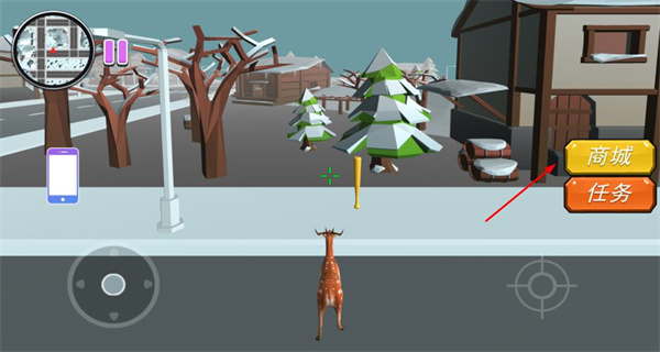 3、進入游戲場景,是雪地城鎮畫面,右側有商城、任務按鈕,點擊商城,進入武器商城界面。