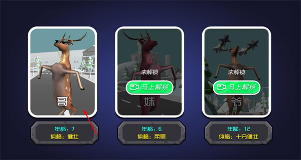 2、在角色選擇頁面,有哥、妹、爺三個角色,選擇哥角色,該角色年齡7、體格健壯,進入游戲場景。